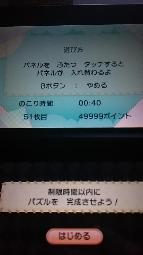 Tasポケモンoras ポケパルレ ぱったんパズル(むずかしい) ゲーム ⠘⠱⠣⠒⠖.  ぱったんパズルの無限は、1枚目から順に「易しい」「普通」「難しい」のパズルがローテーションして重なっていきます。 易しいレベルだとあっさりクリアできますが、難しいレベルとなると細かすぎてどのパネルと対になっているのか混乱することが急に増えます。 教えてもらったことに加え、私がよさそうだと考えた攻略法をいくつか回答しましょう。 1パズル.  ぱったんパズル Tile Puzzle Shota Kageyama Shota Kageyama 135 60 186 ぱったんパズル終了! Tile Puzzle Complete!.
