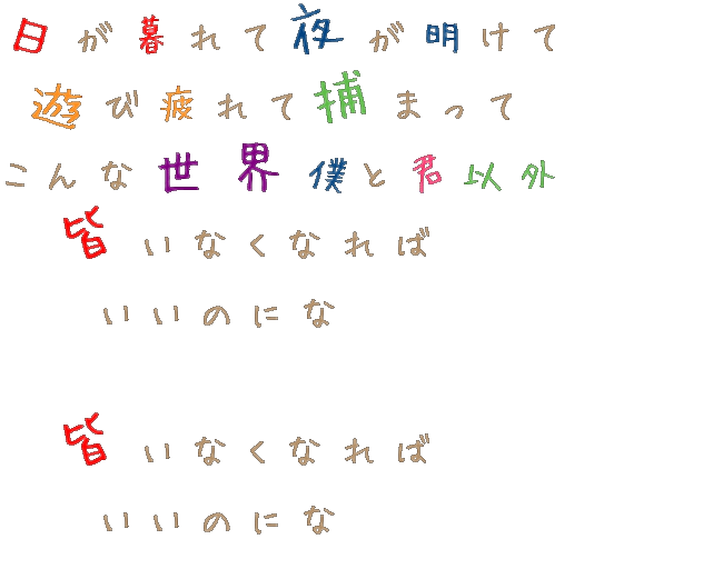 ボカロ歌詞bot 日が暮れて夜が明けて 遊び疲れて捕まって こんな世界僕と君以外 皆いなくなればいいのにな 皆いなくなればいい のにな 六兆年と一夜物語 Ia