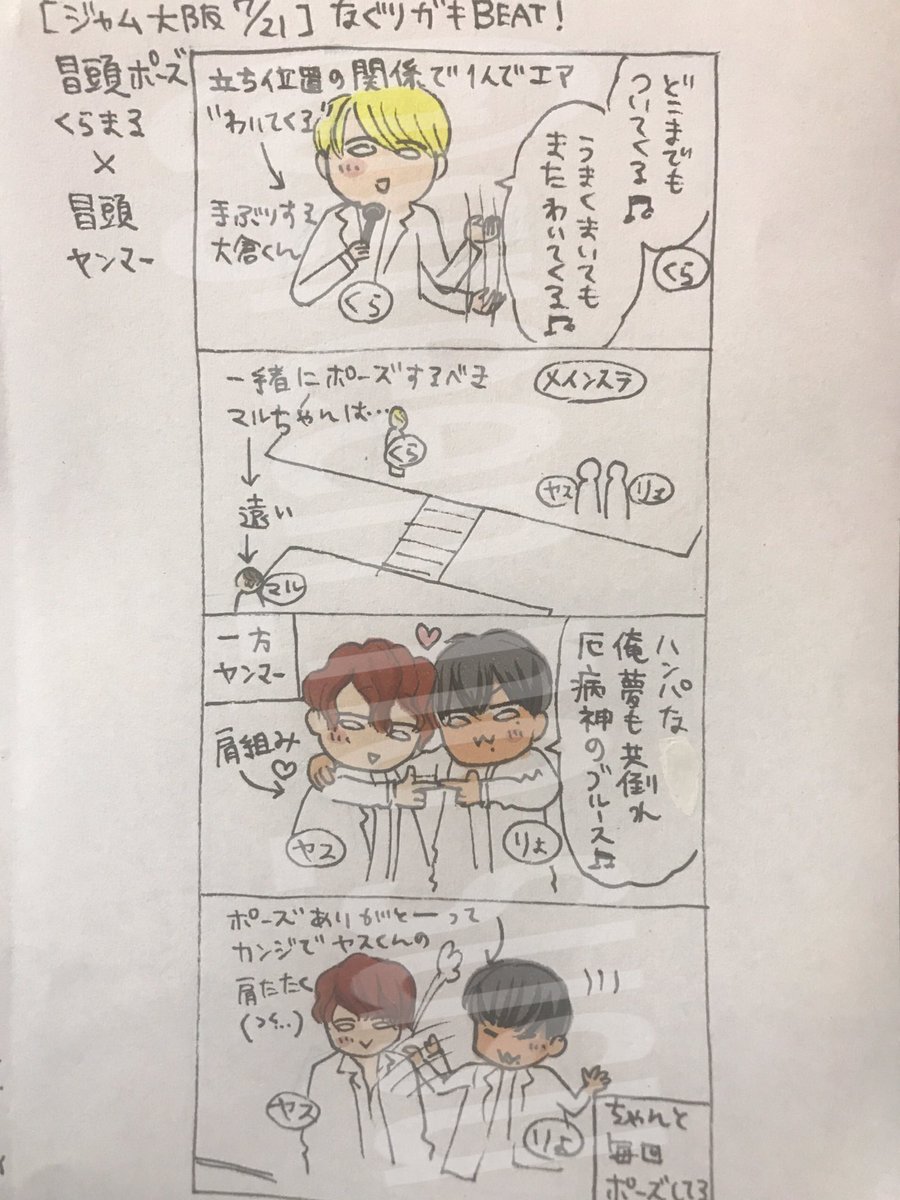 シュシュ Auf Twitter ジャム 大阪7 21 なぐりガキbeat メンバー全員ステージを縦横無尽に走り回って歌っているので 冒頭の 歌詞を歌う時に相方が居ない倉丸 冒頭のポーズを一緒にやるためにそばにいるヤンマー それぞれから目が離せません