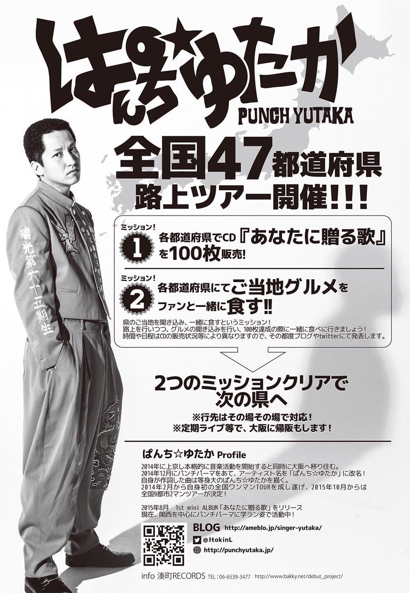 二代目ぱんち☆ゆたかオーディション開催!! 第二のぱんち☆ゆたかとして活動したい方大募集! 応募期間 年7月9日(木)10~8月10日(月)2359 応募方法 ①ぱんち☆ゆたかの『最後の歌』ワンコーラス ②ぱんち☆ゆたかへの想い ①②を2分秒内の動画に. 1 talking about this twitterで話題の学ランぱんちパーマ「ぱんち☆ゆたか」 16年 全国9都市2マンTOURを開催 16年miniアルバム「あなたに贈る歌」を1万枚手売り販売する為、全国47都道府県路上ツアーを開催中. ぱんち☆ゆたかの「仲間 feat メロフロートYuKi」歌詞ページです。作詞ぱんち☆ゆたか・YuKi(メロフロート),作曲KOKI。(歌いだし)錆びついた校舎の裏で 歌ネットは無料の歌詞検索サービスです。.