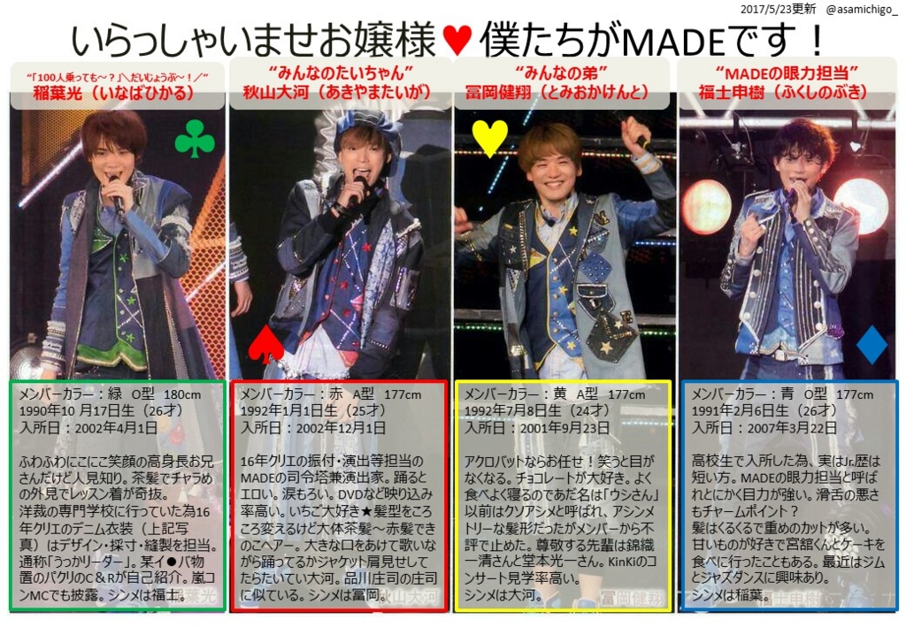 せいか Jr 8 8祭りにてmadeのことが気になった人向けに 以前作った Madeってどんなグループ シートを載せておきます 今年は4月にグループとして初の舞台主演 5 9月に4人それぞれ外部の舞台に出演した後 10月にはジャニーズ伝説19に出演します